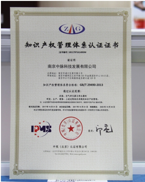 中脉科技获得认证范围包括:床垫、空气净化器与净水器的研发、生产、销售、上述过程相关采购的知识产权管理,这也是业界对中脉科技产品不断重视的表现哦。