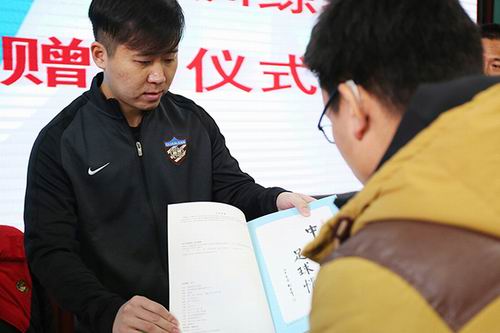 天津权健足球俱乐部校园足球部部长郑毅作为代表向北辰区各校体育老师赠送《来吧!一起踢足球》教材