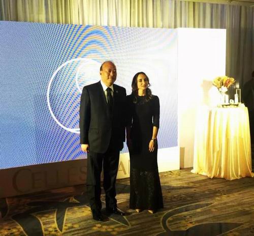 天狮集团李金元董事长与中国意大利商会秘书长Giulia Gallarati在天狮全新护肤品系列前合影