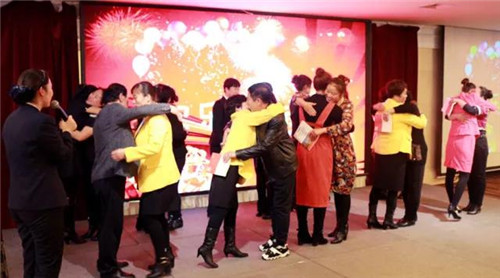 在欢乐迎新会环节,一位老会员带一名新会员走上舞台,老会员用最真挚的情感表达对新会员来自心底的承诺,新会员感谢在权健事业道路上一直有老会员的一路相扶。老会员将《品牌?使命!》一书作为礼物赠与新会员,他们手牵手,深情相拥,并表示在权健的大家庭里相聚,已融为一家人,将一起携手开拓权健事业。