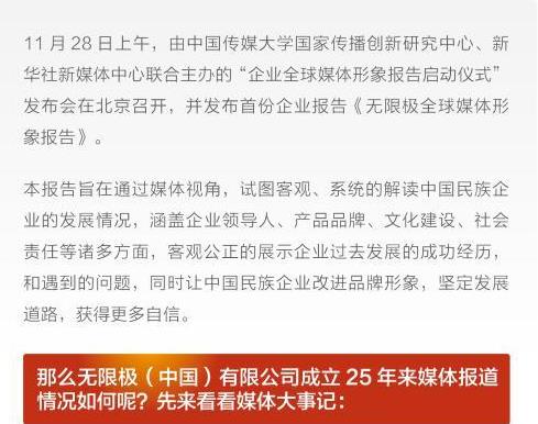 11月28日,由中国传媒大学国家传播创新研究中心、新华社新媒体中心联合主办的“企业全球媒体形象报告启动仪式”发布会在京召开,并发布首份企业媒体形象报告:《无限极全球媒体形象报告》。