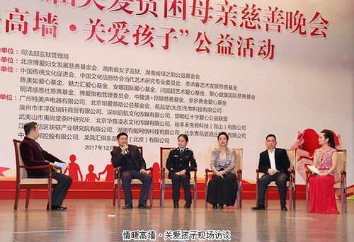 晚会现场,司法部监狱管理局与北京博爱妇女发展慈善基金会启动了“情暖高墙·关爱孩子”公益项目。据介绍,项目从2018年开始将在部分省市司法及监狱系统,特别是女子监狱对服刑人员的失学孩子进行帮扶工作,让他们重新走进课堂,同时邀请医务专家为监狱基层警察及服刑人员患者开展“慈善义诊”,这也是第一次由司法部行政主管部门与慈善组织合作为特殊的孩子开展救助工作。