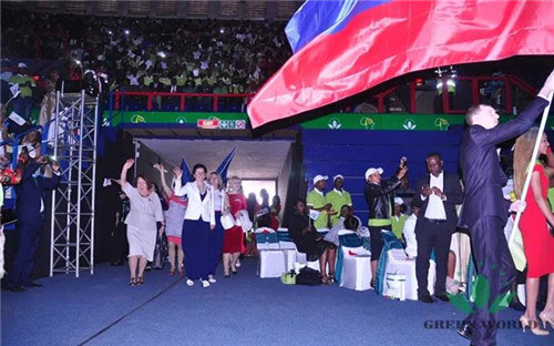 Ellis Park Indoor Arena座无虚席,会场上方高悬印有此次会徽的旗帜和分别代表绿世界全球40多家分公司的国旗。绿色缎带映衬在雪白的椅套上,望之令人神清气爽。中午12点,在全场沸腾的欢呼声中,来自19个国家近200名菁英挥舞着本国国旗列队入场。刹那间会场司旗飞扬、掌声雷动、欢呼声此起彼伏。和着律动的音乐,南非绿世界事业伙伴向全球绿世界领导人展示了非洲大陆特有的热情。