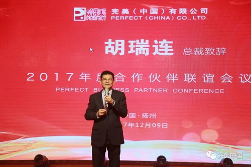胡瑞连在致辞中表示,完美公司从成立之初的默默无闻,发展到稳居世界十大直销企业前列,今日的成绩离不开所有完美人的努力,也离不开完美合作伙伴一直以来的理解、支持和帮助。感谢大家不仅持续为完美提供优质的原材料及服务,而且大力支持完美举行的各类公益慈善活动。今后,希望大家不忘初心、紧密合作、平衡发展,与完美达成长远的战略合作关系,并期望与合作伙伴一起,在中国市场赢得更大的发展,让创新共赢之路走得更远。