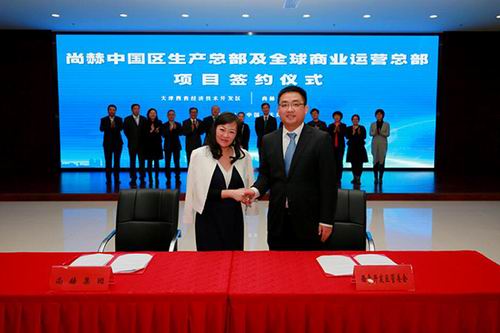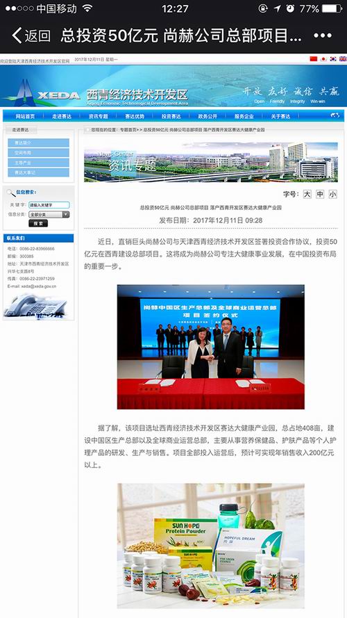 近日,尚赫公司与天津西青经济技术开发区签署投资合作协议,陈旻君执行长应邀出席。这一次,尚赫投资50亿元,选址西青经济技术开发区赛达大健康产业园建设总部项目,总占地408亩,该项目全部投入运营后,预计可实现年销售收入200亿元以上。这将成为尚赫公司专注大健康事业发展,在中国投资布局的重要一步。