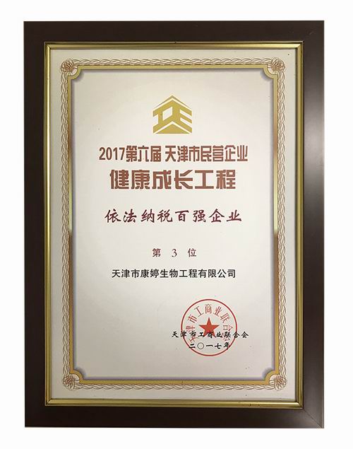 康婷公司历经21年的发展,在刘小兵董事长和杨琪总裁的带领下,坚持以人为本、诚信经营、创新驱动、服务社会的企业理念,已发展成为一家集研发、生产、销售为一体的生物科技型企业,此次荣列天津市民营企业“健康成长工程”依法纳税百强企业第3位是政府和社会各界对康婷公司发展的高度肯定,康婷公司将再接再厉,继续坚持稳中求进,加大创新力度,研发工匠产品,为人类健康事业,为天津经济发展和社会和谐做贡献!