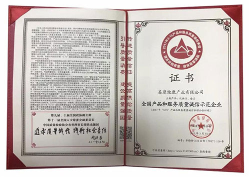 ▲圣原荣获全国产品和服务质量诚信示范企业证书