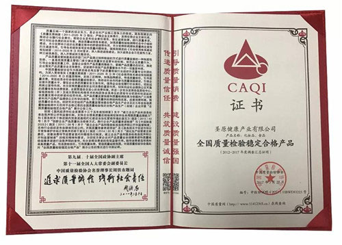 ▲圣原健康产品荣获全国质量检验稳定合格产品证书