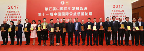 第五届中国民生发展论坛暨第十一届中国国际公益慈善论坛现场对精准扶贫带头人、“2017年中国民生示范工程”项目、2017年度中国健康公益大使、2017年度公益慈善人物进行表彰。权健代表欧阳潮鸿、罗星桥、李宏伟、李凯明、匡芳、田芳、么佳莉、齐长青、郑凯、邱楷、刘燕、刘朔、周游、张禄、赵文搿、翟立新、孟令国、苏彦麟、姚志刚、张传九共20人荣获“2017年度中国健康公益大使”荣誉称号,第十一届全国政协副主席白立忱为获奖者颁奖。