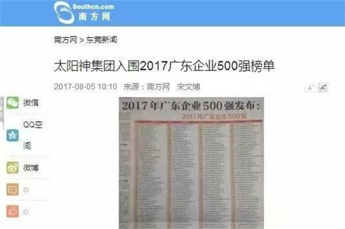 太阳神凭借在保健品行业30年的深厚积淀、优秀的产品品质、良好的消费者信誉,入围广东省2017年度企业500强。