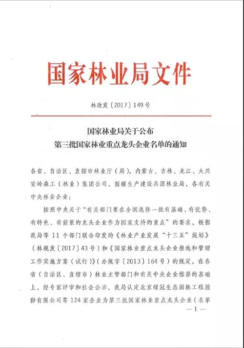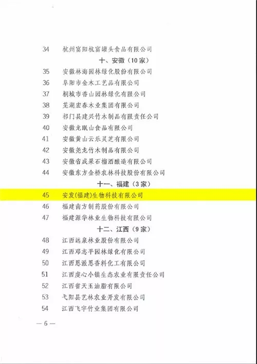 根据2017年12月27日《国家林业局关于公布第三批国家林业重点龙头企业名单的通知》(林改发【2017】149号)文件通知,安发(福建)生物科技有限公司荣获国家林业重点龙头企业,成为全国124家、福建省3家之一。该项申报历时9个多月,2轮答辩和实地审核,终获成功。