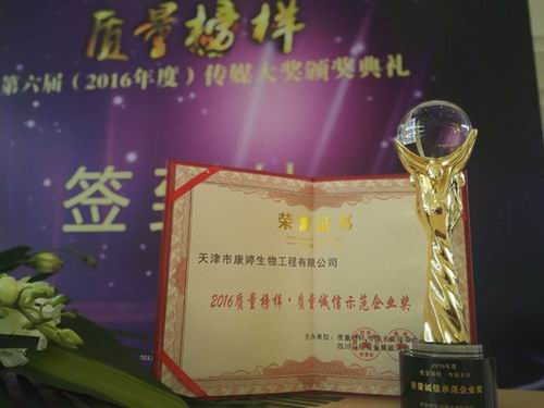 5、2017年1月21日,康婷践诺守信,用诚信铸就品牌,康婷公司荣获“2016质量榜样·质量诚信示范企业奖”。