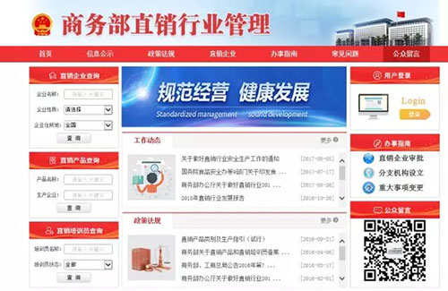 还有疑问?商务部会在微信上在线回答网友提问!扫描下方二维码,关注“商务部直销行业公共信息服务”公众号。直销法规政策咨询、直销企业信息查询以及办事流程咨询皆可在此找到。公众平台服务时间为工作日8:00-17:00。