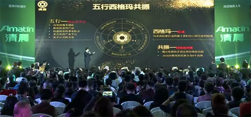 “五行”指的是清晨生物的五大核心竞争力,高效的服务团队、极致的系列产品、快速创富的事业机会、多元化的产业平台以及直击心灵的文化,“西格玛”代表着标准,清晨要打造一套属于我们自己的标准,“共振”指的是清晨打造的一整套系统化的帮助经销商发展的手段。