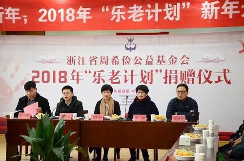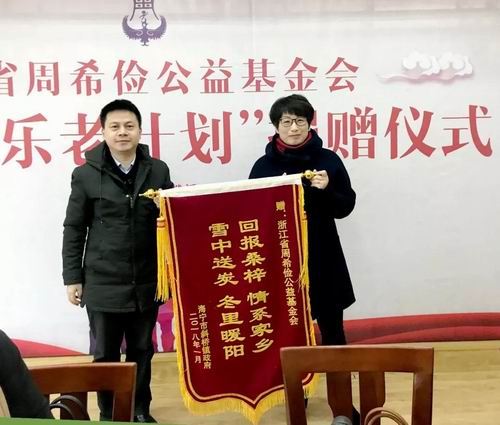 1月23日,浙江省周希俭公益基金会2018年“乐老计划”捐赠仪式在海宁市斜桥镇仲乐村隆重举行,海宁市人民政府副市长沈勤丽、浙江省周希俭公益基金会理事长周俐、浙江省周希俭公益基金会理事张建仑、海宁市斜桥镇党委书记王剑文以及斜桥镇仲乐村党组织、村委会代表和仲乐村20名老年人代表共同参加了此次活动。