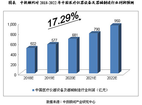 2016年,规模以上医疗仪器设备及器械制造业利润总额达到318.49亿元,同比增长32.29%。我们预计,2018年我国医疗仪器设备及器械制造行业利润将达到502亿元,未来五年(2018~2022)行业年均复合增长率约为17.29%,2022年将达到950亿元。