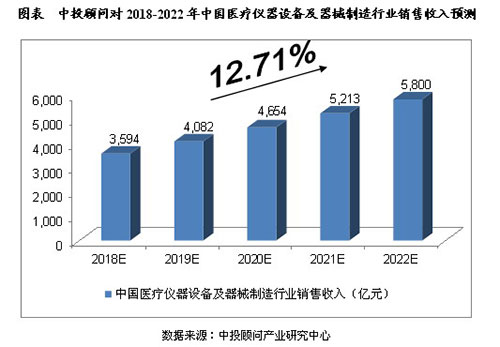 2016年,规模以上医疗仪器设备及器械制造业主营业务收入为2,765.47亿元,同比增长13.25%。我们预计,2018年我国医疗仪器设备及器械制造行业销售收入将达到3,594亿元,未来五年(2018~2022)行业年均复合增长率约为12.71%,2022年将达到5,800亿元。