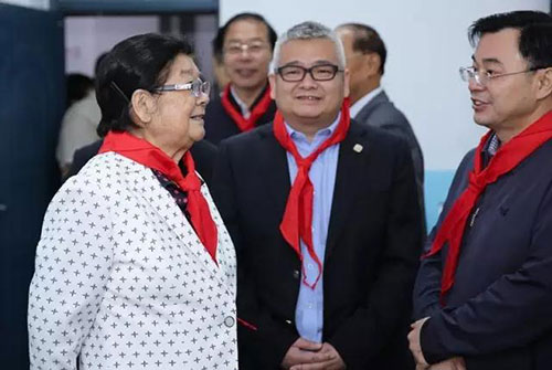 第十届全国人大常委会副委员长、中国关心下一代工作委员会主任顾秀莲(前排左)在中脉公益基金会主席周希俭(前排中)的陪同下参观朝阳卫生室