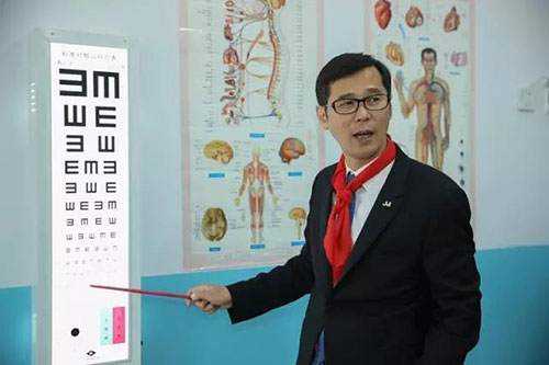 中脉公益基金会副主席薛勇在朝阳卫生室为孩子测视力