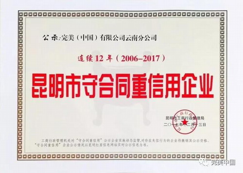 近日,凭借良好的企业信用,完美云南分公司荣获由昆明市工商行政管理局、昆明市合同信用促进会颁发的“连续12年(2006-2017)昆明市守合同重信用企业”荣誉称号。