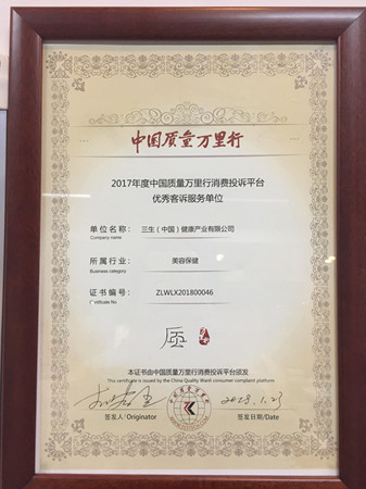 2018年1月11日,中国质量万里行消费投诉平台授予三生(中国)健康产业有限公司“2017年度中国质量万里行消费投诉平台优秀客诉服务单位”。