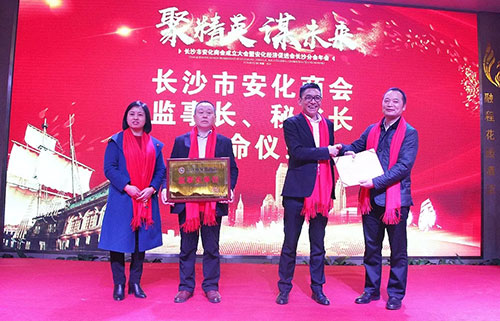 中共安化县委副书记王新宇为长沙市安化商会秘书长瞿吉辉颁发聘书,安化县政协副主席、总商会会长李艳云为长沙市安化商会监事长彭接班授牌