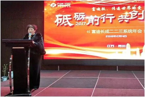 叶根女士发表致辞,首先她对到场的家人们表示热烈欢迎,并对长成二二三系统在过去一年的战绩作出了高度评价,对所有系统家人们的辛苦付出表示衷心感谢。她说道:2017年是直销竞争最为激烈的一年,也是面临转型的关键之年,同时也是我们实现第三次腾飞的一年,在艰难中有你们风雨同舟,感恩有你。富迪公司是一个有故事的企业,是行业的标杆,在业界有非常突出的位置,我们的小分子肽取得了美国FDS,欧盟CE,瑞士SGS以及国内权威认证,卓越的品质,树立了良好的口碑,造福了广大的消费者!2018,我们将弘扬大爱文化,从心出发,让爱回家……