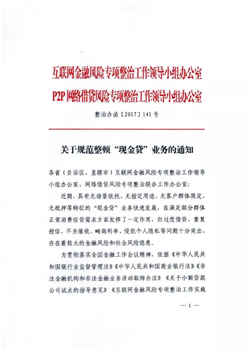 国家互联网金融风险专项整治工作领导小组办公室、网络借贷风险专项整治联合工作办公室在2017年12月1日发布的《关于规范整顿“现金贷”业务的通知》,指出“过度借贷、重复授信、不当催收、畸高利率、侵犯个人隐私等问题十分突出,存在着较大的金融风险和社会风险隐患”,前述通知也明确了“现金贷”的开展原则(后附通知全文)。