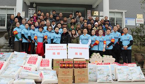 权健四川分公司经理陈丽娟女士带领分公司员工以及来自成都、重庆等十余名经销商伙伴组成权健爱心志愿小组,其中,永成系统胶州团队钱庆宇老师捐出善款,结缘系统李贵生老师、唐文彬老师组成十余人权健爱心小分队,权健志愿者们冒着深冬的严寒,深入到泸县喻寺镇周堰村,对当地贫困户及敬老院孤寡老人们进行慰问,开展了形式多样的春节送温暖活动。