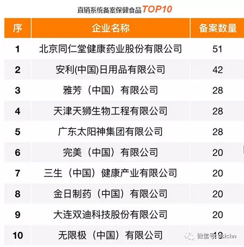截止2017年底,备案保健食品总数达到660个,占总产品数的16%。2017年刚刚获得直销牌照的北京同仁堂健康药业股份有限公司就备案了51款产品,数量甚至超过安利(中国),排在第一位。
