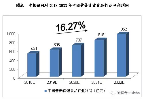 综合以上因素,我们预计,2018年中国营养保健食品行业利润将达到521亿元,未来五年(2018-2022)年均复合增长率约为16.27%,2022年中国营养保健食品行业利润将达到952亿元。