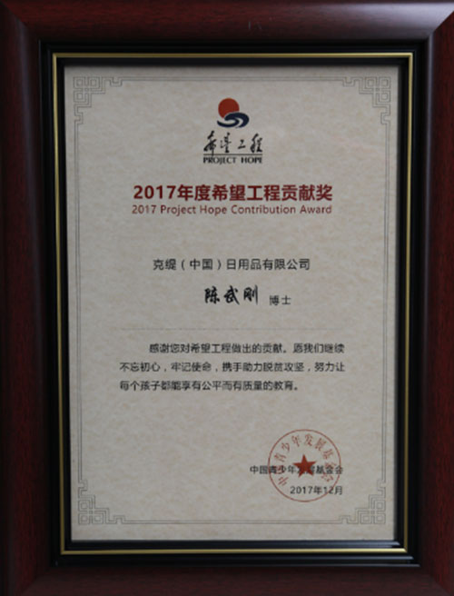 克缇的爱心善举受到了中国青基会的支持和肯定,2017年12月,中国青基会特授予克缇(中国)总裁陈武刚博士“2017年度希望工程贡献奖”荣誉,授予克缇(中国)“最佳合作伙伴”奖。