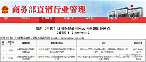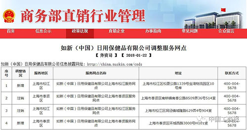 如新(中国)日用保健品有限公司变更该公司上海市松江区和奉贤区的服务网点;新增宁夏回族自治区银川市金凤区服务网点,注销该公司宁夏分公司的服务网点。