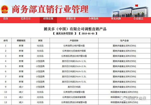 圃美多(中国)有限公司、嘉康利(中国)日用品有限公司、康宝莱(中国)保健品有限公司、上海春芝堂生物制品有限公司调整直销产品范围。