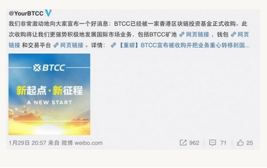 今年1月29日,比特币中国官方微博和公众号同时发布消息,宣布被香港区块链投资基金收购。宣告写道:“BTCC作为全球运营历史悠久的比特币交易平台,今日正式宣布被香港区块链投资基金收购。”被收购后,BTCC表示进行业务调整,把业务重心完全转移到,BTCC矿池、Mobi数字资产钱包和美元现货交易平台。