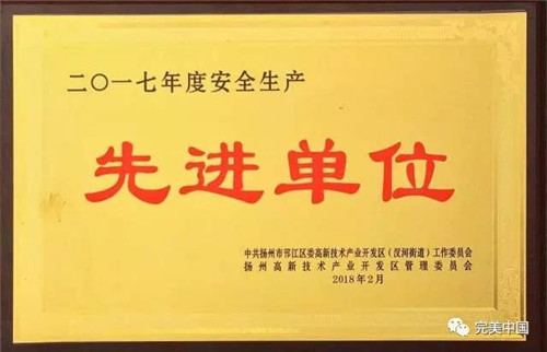 扬州完美始终把安全生产放在生产管理的首位,认真贯彻执行安全生产法律法规,不断完善安全保障体系、安全监督体系,强化安全生产责任制,并将安全责任落实到人,实现安全生产无事故。