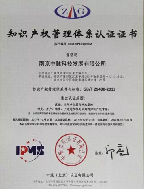 11月,经过严格的材料评审、内部审核、现场审核等一系列完整考核程序,中脉顺利通过了知识产权管理体系审核认证,并被授予《知识产权管理体系认证证书》。中脉获得认证范围包括:床垫、空气净化器与净水器的研发、生产、销售、上述过程相关采购的知识产权管理。这代表中脉知识产权管理水平迈向新高度。