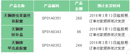 注:天狮大中华网站/天狮e商城购买含以上产品的订单(包括“狮城新天地”、“商品展厅”模块),均按照以上时间进行发货!
