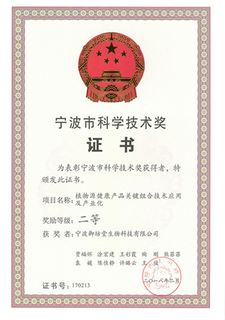 近日,经推荐申报、专家初评和市科学技术奖评审委员会评审,宁波御坊堂生物科技有限公司“植物源健康产品关键组合技术应用及产业化”项目被授予宁波市科学技术进步奖二等奖。