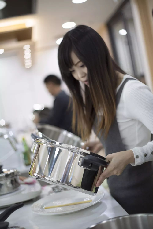 顾客在安利深圳体验馆体验用安利皇后锅烹调美食