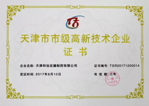 近日,天津和治友德制药有限公司正式获得“高新技术企业”认定证书,标志着企业在高新技术研发、知识产权综合实力的成就得到国家相关部门的肯定与认可。