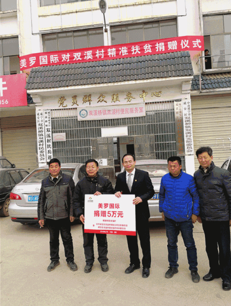 湖北分公司本着集团两位联合创始人“以德筑基业,以德兴企业”的理念,响应政府号召,积极参与当地精准扶贫公益活动。今年年初,他们带着全体美罗国际人的心意,向湖北省咸宁市下属的贫困村——咸安区汤垴村、双溪村,分别捐赠人民币5万元,共计10万元,用于两村的脱贫攻坚事业。