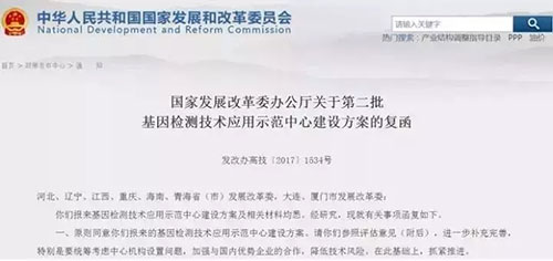 2015年国家发改委将基因检测技术应用示范中心纳入“新型健康技术惠民工程”,支持拥有核心技术、创新能力和相关资质的机构,采取网络化布局,建设示范中心,以开展遗传病和出生缺陷基因筛查为重点,推动基因检测等先进健康技术普及惠民,引领重大创新成果的产业化。