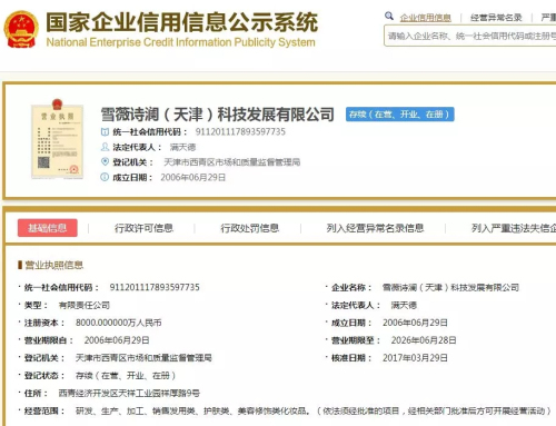 国家企业信用信息公示系统显示,雪薇诗澜公司注册于2006年6月29日,法人代表兼执行董事为满天德,监事为沈载华。股东方面,满天德出资51%,沈载华出资49%。其注册资本于2016年2月29日由77.33.4万元增资为8000万元。