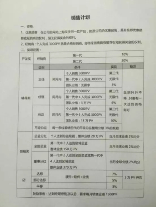 另外,个人完成3000PV就是合格经销商,就具有推荐权和获得奖金的权利。并且只要达到了一定的级别,还有开发奖(拿两代)、辅导奖(主任、经理、总监、平级总监)、领袖奖(总监分红、全国总监、董事分红)、店补等。