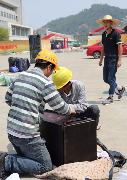 ▲施工人员忙碌地布置舞台、搭建灯光、安排座椅和摆放物资