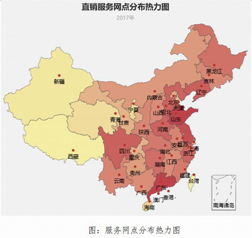 从服务网点分布热力图上可以明显看出,服务网点重点分布在经济发达地区,西部省份相对少很多。其中山东、广东、江苏、浙江一带分布最多。
