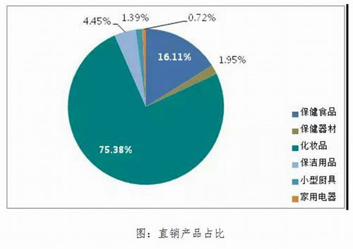 2017年直销市场公示的直销产品涉及化妆品、保健品、保洁用品、保健器材、小型厨具和家用电器共六类4160种,其中化妆品占所有直销产品的75.38%,保健食品占16.11%、其余四类产品占比8.51%。数据显示,直销产品种类少、产品集中、产品同质化现象比较明显。