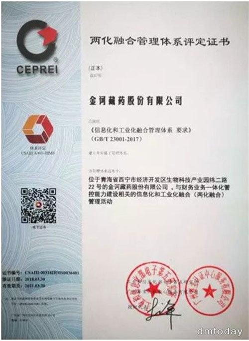 2018年4月8日,金诃藏药正式通过国家工业和信息化部专家审核并获得“两化融合”管理体系评定证书。这使金诃藏药不仅跻身成为通过国家“两化融合”审核企业中的一员,更成为藏药行业目前唯一通过“两化融合”管理体系评定认证的企业,标志着金诃藏药的标准化建设取得又一里程碑式的跨越。