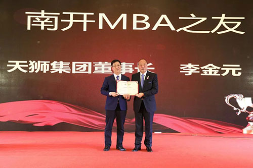 南开大学MBA校友会会长韩连胜(左)向李金元董事长(右)颁发“南开MBA之友”证书